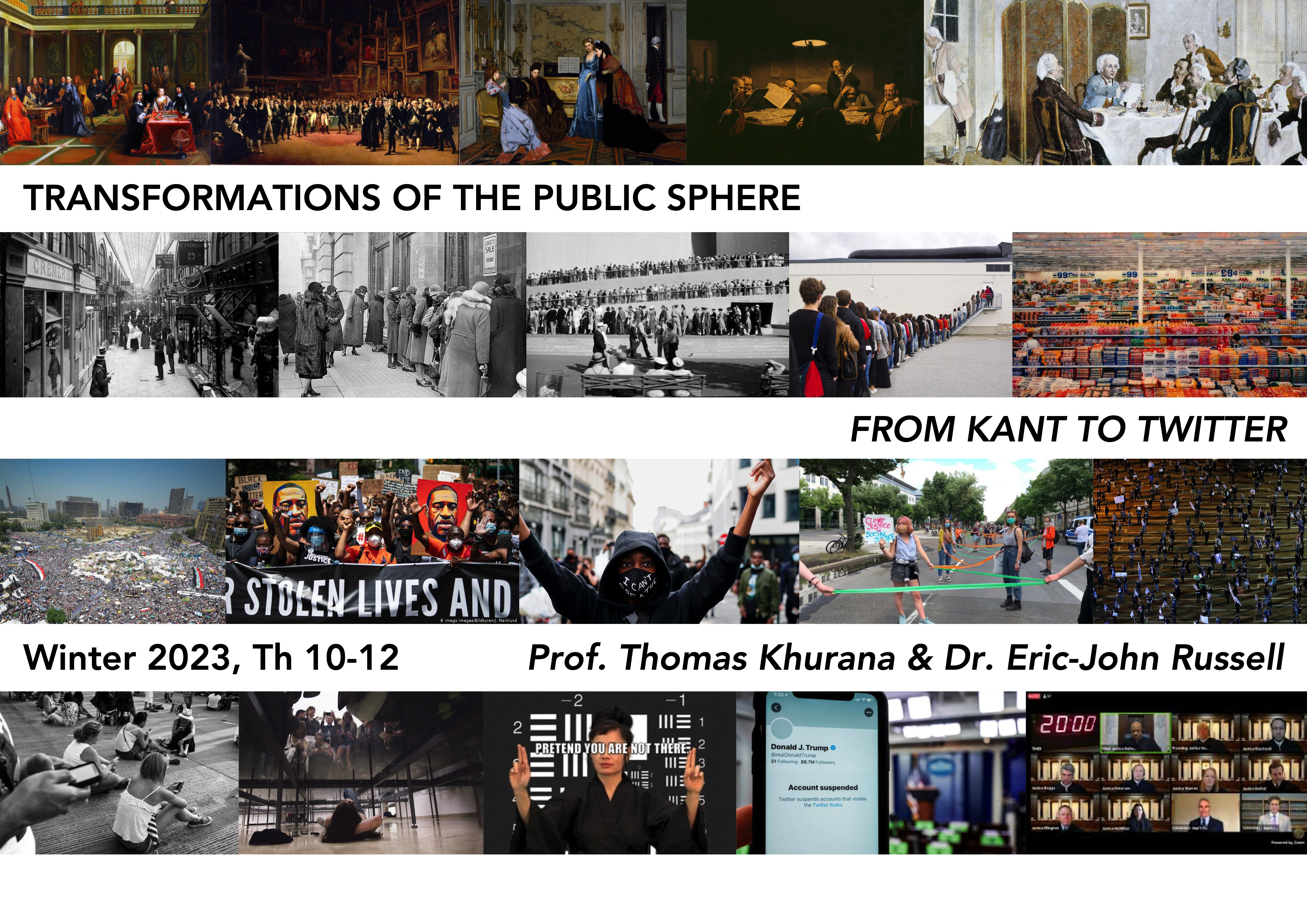 The course offers an in-depth discussion of the idea, the structure and the recent radical transformations of the ”public sphere”, generally considered to be a cornerstone of liberal society. We will first explore the modern emergence of the critical public sphere from the public forum of literary discourse and critique. In a second step we will turn to two waves of ”structural transformations of the public sphere” (Habermas): first, its transformation through mass media and consumer culture, and secondly, the recent transformation of the public sphere through social media. Both transformations have been welcomed as having the potential of giving rise to a democratization of public life, but at the same time seem to endanger the emancipatory ideals of enlightenment and critique at the very heart of the public sphere. We will highlight the ambivalent character of the recent changes, discuss the fragmentation, capitalization, and surveillance of public life as well as strategies of resistance. Among the authors and artists we will discuss are Kant, Hegel, Arendt, Benjamin, Adorno, Habermas, Luhmann, Debord, Lessig, Paglen, Poitras, Dean, Steyerl.
